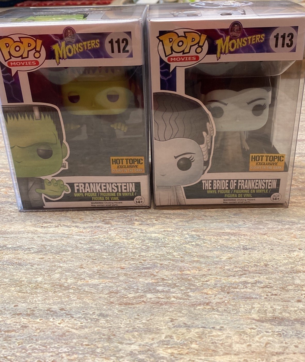 New NRFB Funko Pop GITD Bride of Frankenstein and GITD Frankenstein. Come with protectors. Please see pictures for expanded description, condition and information. Please note colors may vary slightly based on monitor. Please refer to manufacturer directions and safety recommendations. Most of my items ship out within 24 hours on weekdays.