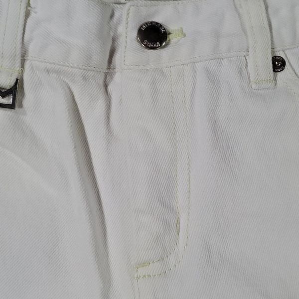 White with a lime/yellow colored stitching and raw hemline on both pant legs. Front and back usable pockets and button and zipper closure at the fly.
